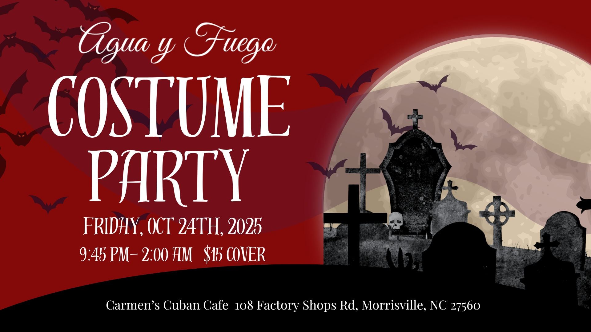 EVENT DETAILS Price: Only $15 for the cover for this great party or $12 with Valid Military or Student ID ( Cash or Card will be accepted at the door) Dress Attire: Halloween Costumes. Keep it fun, tasteful and respectful. Cash Prizes for best costume!! Drink Specials: Served at the bar by our experienced bartenders Age Limit: 18 to Party and 21 to drink Location: Carmen's Cuban Cafe, 108 Factory Shops Rd, Morrisville, NC 27560 Times: - 9:45pm - Free Salsa Lesson - 10:00pm - Social